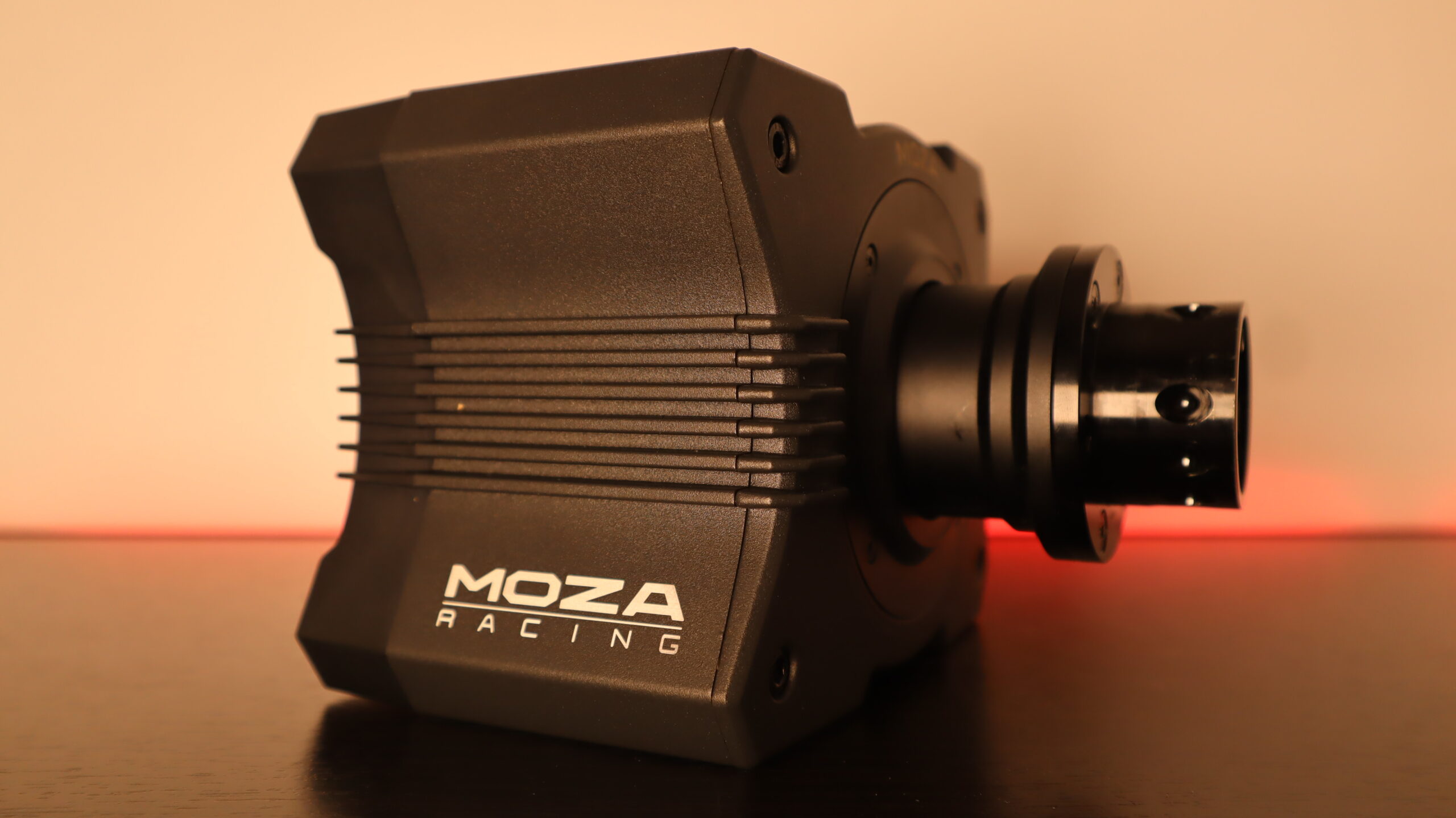 The MOZA R5 base is essentially a tiny matte-black aluminum cube — compact, lightweight, and simplified to the extreme.