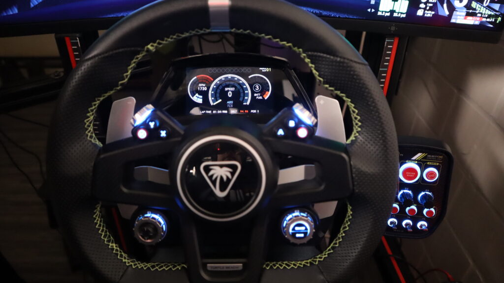 Lighting, the large display, and the integrated button box all contribute to an immersive cockpit setup.